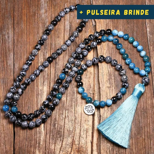 Japamala de 108 Contas + Pulseira. Obsidiana floco de neve e Apatita. Proteção e Evolução Pessoal
